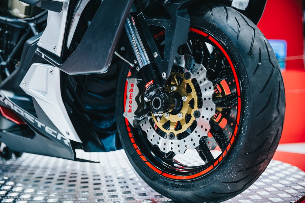 Der DRAGSTER 559 Twin ist mit einer passenden Bremsanlage ausgestattet, die aus doppelten schwimmend gelagerten Scheiben mit Wave-Profilen besteht. Die vordere Bremsscheibe hat einen Durchmesser von 270 mm, während die hintere 230 mm misst.