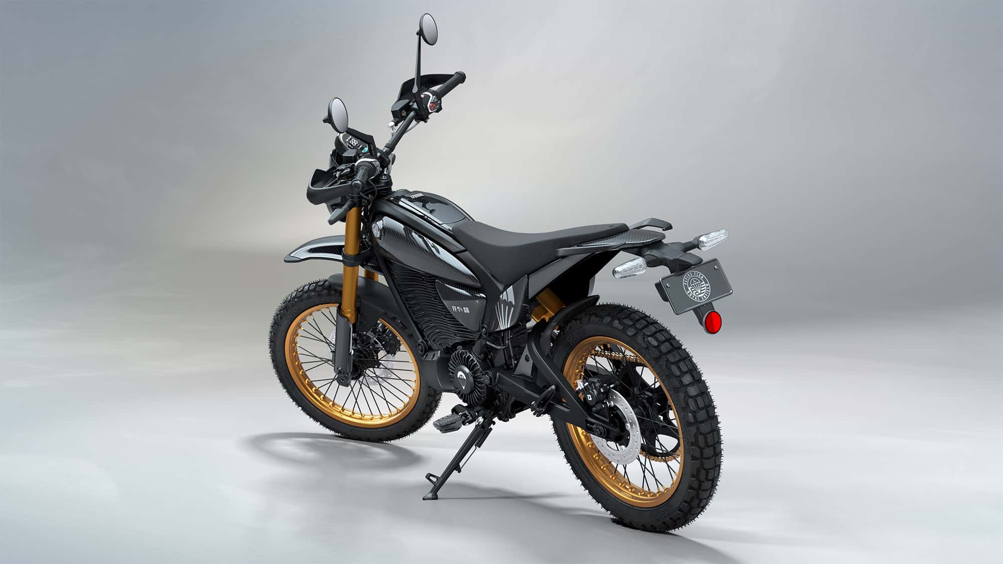 Das Design orientiert sich klar am Scrambler-Stil. Eine USD-Gabel, Kettenantrieb sowie eine Radkonfiguration mit 19 Zoll vorne und 18 Zoll hinten sollen Fahrstabilität und Offroad-Tauglichkeit unterstützen. Der lange Sitz im Enduro-Stil verspricht Komfort auf unebenem Terrain. Besonders auffällig: das gerippte Magnesium-Batteriegehäuse, das Gewicht spart und für eine verbesserte Kühlung sorgen soll. Das Gestaltungselement mit unterschiedlich angeordneten Finnen symbolisiert den Brückenschlag zwischen Vergangenheit und Gegenwart der Marke.